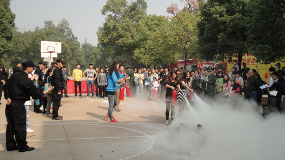 上午9点30分,消防宣传活动拉开序幕。消防官兵向现场师生发放了消防宣传读本、宣传单,并结合平时灭火的经验和典型案例,向现场师生讲解了火灾的危害、日常生活中预防火灾的措施、发生火情后如何报警、初期火灾的扑救、火场逃生与自救等知识。活动现场还设有消防器材展示区,陈列了充气救生气垫、消防避火服、模拟烟气室等装备,消防宣讲员仔细讲解和演示了各种消防装备的用途和使用方法。现场师生亲身体验了模拟烟气室逃生,在消防官兵指导下弯腰捂住口鼻,依次迅速穿越帐篷烟雾区,体验亲临火场的“逃出生天”;部分同学背上氧气瓶,穿上厚厚的消防避火服,体验了消防官兵负重作业的场景。在灭火演练环节,消防宣讲员向在场师生详细讲解并演示了灭火器的使用方法,并组织现场师生四人一组轮流进行灭火演练。
