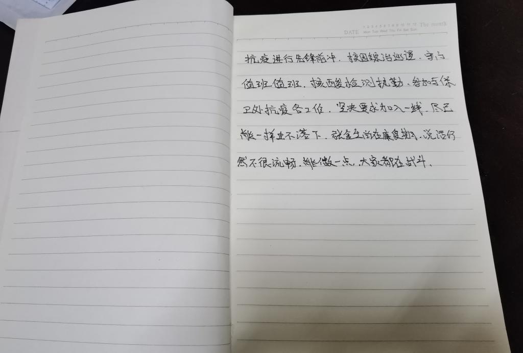 “尽己所能一样不落下……能做一点(是一点),大家都在战斗。”这是张金生在得知笔者前来采访时,因为害怕自己表达不清楚,一笔一划在本子上写下的话。