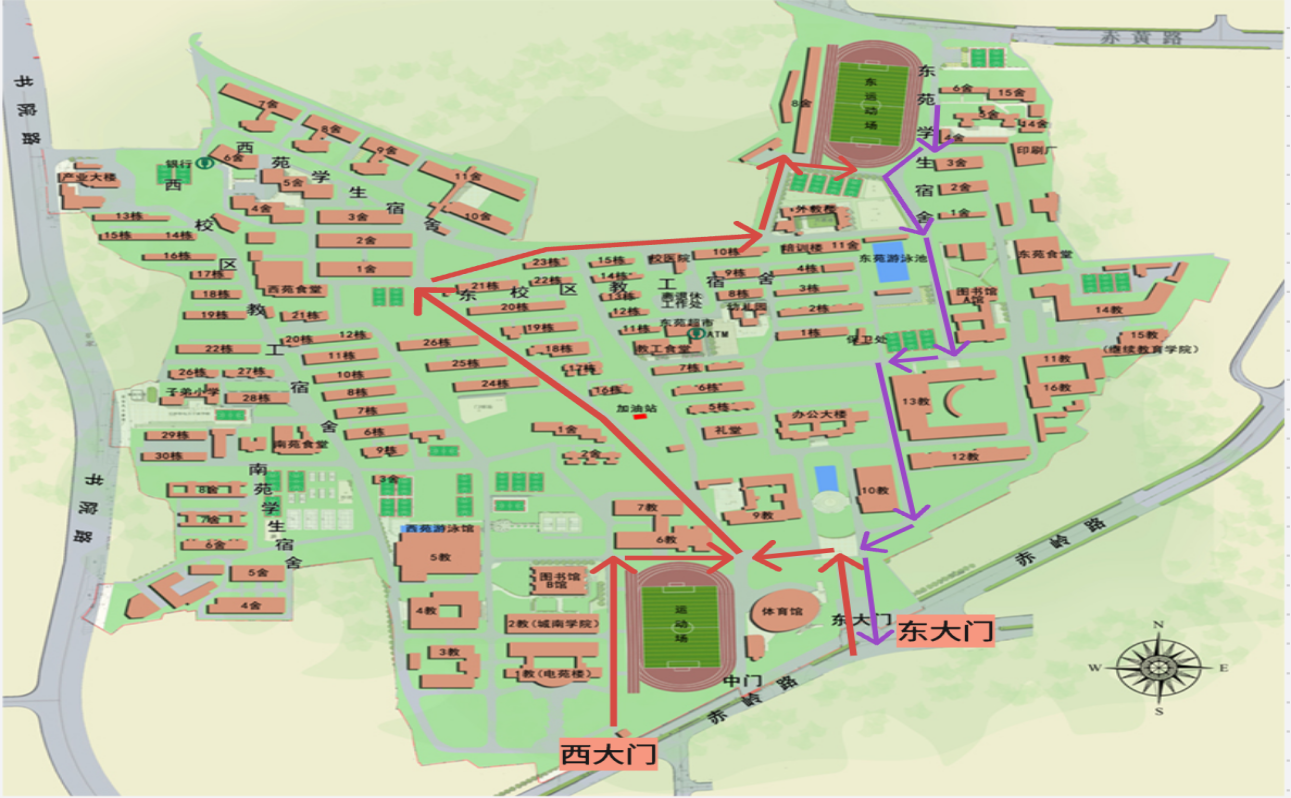 线路1.东大门→6、9教路口→加油站→西苑(卸行李后即停即走)→校医院→外教楼→东运动场(停放)。