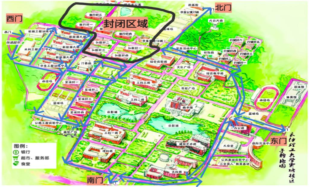 二、9月28日下午2:00至9月30日下午6:00, 云塘校区实行交通管制,东门、南门可进可出,西门只进不出,北门只出不进。弘毅轩、敏行轩、16栋合围区域封闭,不允许车辆进入。