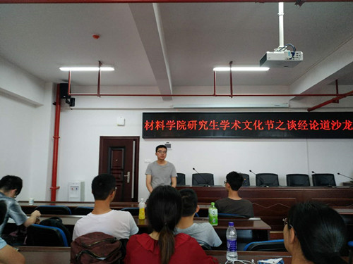 5月18日,材料学院于新能源大楼302室举办研究生学术文化节系列活动之“谈经论道沙龙”。本次活动由18届优秀研究生毕业生张健、姚琦、黄国游主讲,全体研究生及部分本科生参加,研究生辅导员陈鑫林出席。