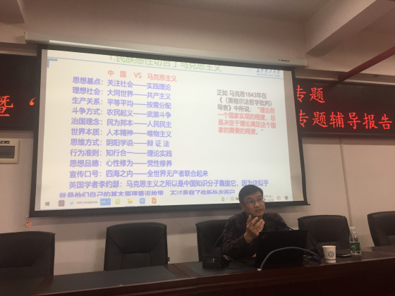 陈教授结合自身的从教经历、切身体会,以独特的研究视角从“深刻理解习近平总书记重要论述”、“马克思主义为什么行的历史逻辑”和“自觉学习和运用马克思主义原理”三个方面以及围绕理论、历史和实践三大逻辑生动阐述了马克思主义强大的思想魅力和实践伟力,回答了“马克思主义为什么行”的历史性课题,指出了马克思主义之所以被中国人民选择、运用、坚持和发展,是因为她与中华民族的思想基础和文化心理相适应,契合了中华民族重变易、重类比、重实用的民族性,是理论满足于国家需要的程度,为中华民族复兴提供了强大的精神力量。