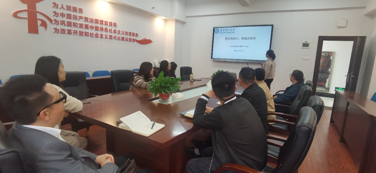 11月21日下午,无机非金属材料系教工党支部在新能源大楼1-317举行主题党日活动,以“廉洁润初心、铸魂担使命”为主题。活动由支部书记易文君主持,支部成员参加。