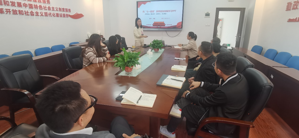 接下来由陈曙光、成茵、王怡静、迟光芳给大家讲授微党课。陈曙光老师以“三尺讲台守初心、立德树人敢担当”为题,讲述了教育工作者要爱岗敬业、甘于奉献,做人民满意的好老师。成茵老师讲述了“2021七一勋章“获得者张桂梅同志的事迹,号召大家学习她执着奋斗、无私奉献的至诚情怀。王怡静老师以”廉洁自律贵在“四慎““为题,带领大家学习了”慎初、慎微、慎独、慎权“的含义,激励大家筑牢思想防线,提升党性修养,做到廉洁自律。迟光芳老师以“峥嵘百年史、建功新时代”为题,学习了百年以来青年针对当下局势做出的选择及努力,激励新时代的青年教师们勇于担当、奋勇直前。