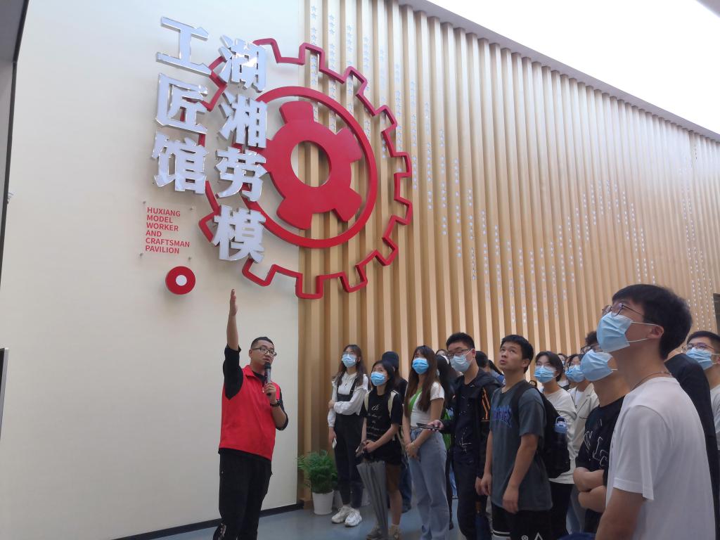 第一站师生们来到了湖南省首个大型劳模工匠主题展馆—湖湘劳模工匠馆,该馆陈列了湖南近百名著名劳模工匠的奋斗故事。馆内讲解员卢红光讲解道:“劳模工匠馆的标识是由齿轮和数个五角星构图的湘江组成,齿轮代表着工匠精益求精的精神,每颗星星代表着劳模工匠,汇聚成湘江之形,意味着工匠劳模精神源远流长、永不过时,象征着传承和发扬。”