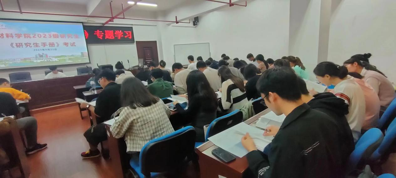 为使2023级新生更快适应大学生活,更加全面、深入学习学校教育管理相关规定,提高遵守学校规章制度的自觉性,贯彻落实“博学 力行 守正 拓新”的校训。9月22日晚,在新能源1号楼303教室组织开展2023级新生《研究生学生手册》考试。2023级全体新生参加考试,此次考试由2022级研会主要干部监考。