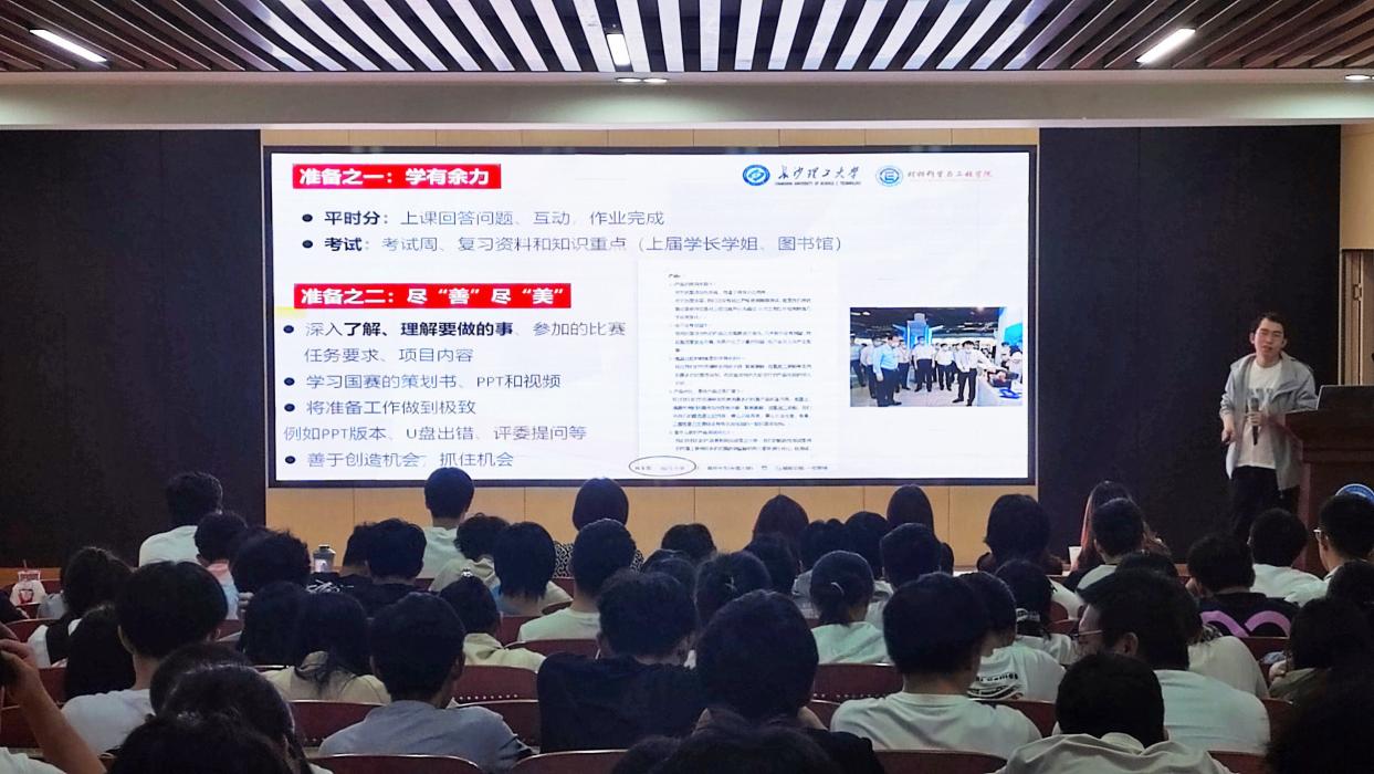 湖南省优秀毕业生何张龙以“奋斗的人生更精彩”为题讲述了他及所在团队7年科创竞赛成长之路。何张龙结合自己参赛经历,特别是在全国“互联网+”大学生创新创业大赛中获得国家级、省级奖励的故事,鼓励学弟学妹们勇敢迈出第一步,一步一个脚印扎实走好大学科创竞赛的奋斗之路。