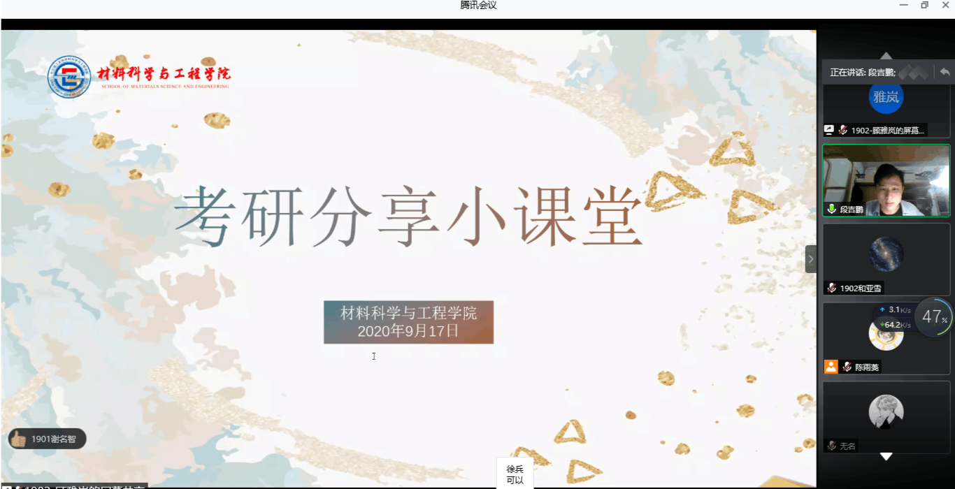 9月17日,材料学院依托于腾讯会议平台开展了生涯发展系列活动之考研经验分享会。本次会议邀请了2020届优秀毕业生陈宇辉、戴舜、刘南海生、段吉鹏进行分享,共40余人参会。