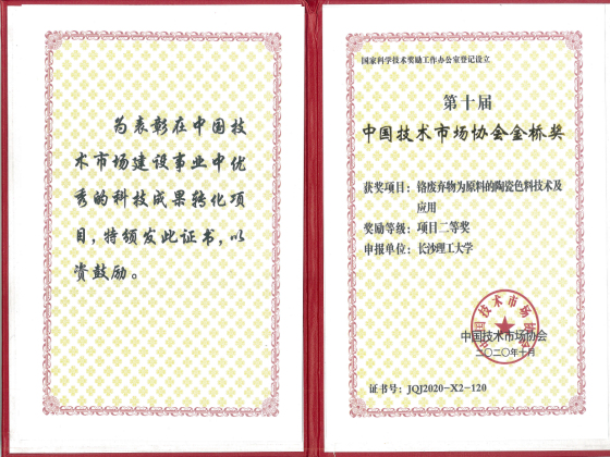 2020年10月22日,中国技术市场协会在山东淄博举办了第十届中国技术市场协会金桥奖表彰奖励大会,我院廖红卫色料团队主持完成的成果“铬废弃物为原料的陶瓷色料技术及应用”继第六届金桥奖后,再次荣获项目奖二等奖,项目第一完成人廖红卫作项目汇报,项目组成员詹文俊代表成果完成团队参加表彰奖励大会。近年来,廖红卫团队与广东佛山天宇陶瓷色料有限公司、江苏拜富科技有限公司等多家公司开展产学研合作,应用威廉体育专利技术,就铬铁合铁制造陶瓷色料及高铬废弃物制造陶瓷色料核心技术产生了很好的社会、经济价值。其中近年来应用铬铁合金制造陶瓷技术生产的主打色料(黑色)占全球市场的60%以上,直接创造税利3亿元/年以上,经济效益及社会效益十分突出。