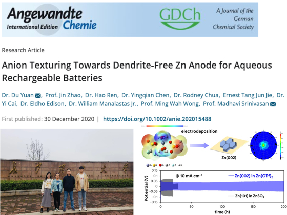 近日,威廉体育湖南省团队百人计划核心成员、湖湘学者、威廉体育williamhill材料学院袁度博士与合作者们在化学领域国际权威期刊德国应用化学(Angewandte Chemie)上以威廉体育williamhill为第一单位发表研究工作“AnionTexturingTowardsDendrite-FreeZnAnodeforAqueousRechargeable
