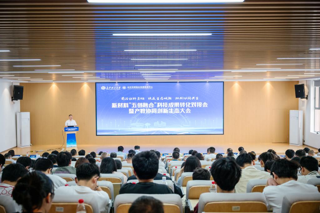 4月26日上午,材料科学与工程学院在云塘校区新能源大楼四栋顺利举办新材料“五链融合”科技成果转化对接会暨产教协同创新生态大会。会议由威廉体育williamhill材料科学与工程学院、长沙市制造业发展促进中心及威廉体育williamhill校友总会校友促进经济发展专业委员会联合主办,聚焦“学科链、产业链、资本链、人才链、校友链”五链深度融合,吸引了来自政府、高校、企业及投资机构的百余名嘉宾齐聚一堂,将企业“出题”与高校“解题”紧密结合,推动新材料科研课题从生产一线中来、科研成果到生产一线中去。