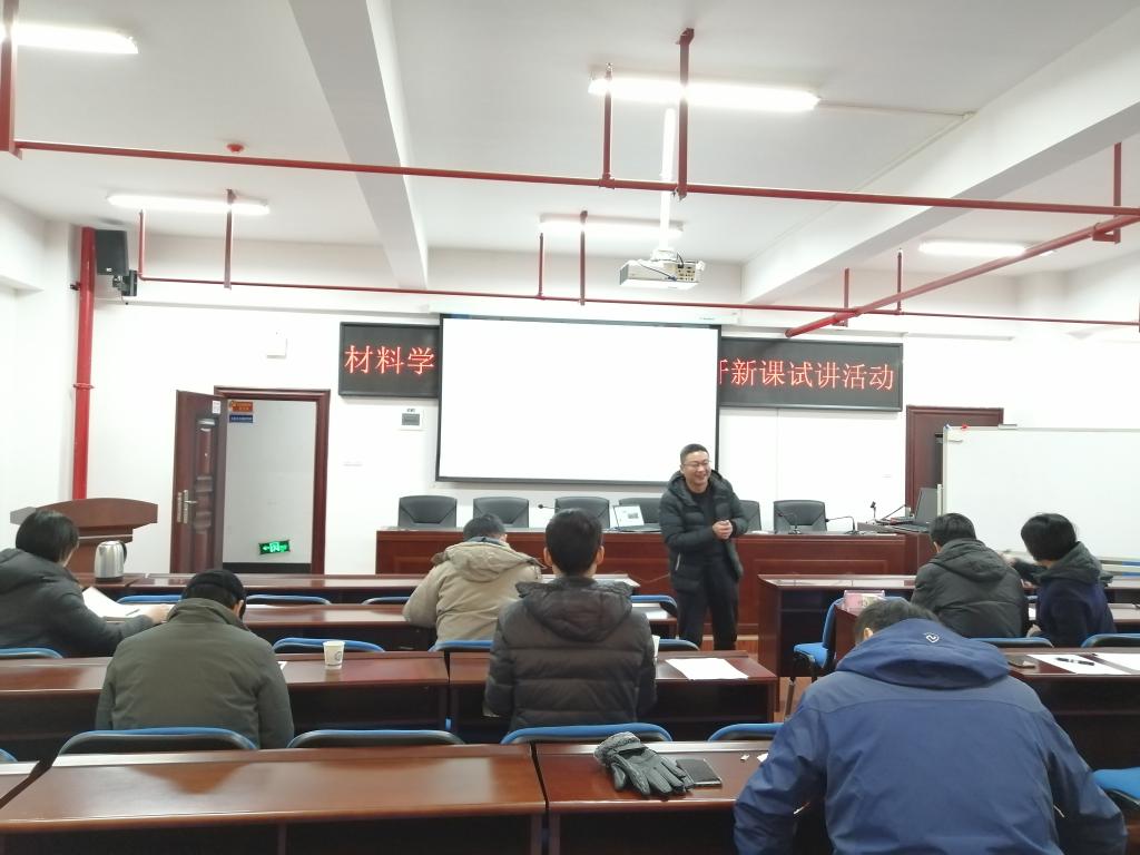 2020年12月15日,在新能源楼1-303,材料科学与工程学院进行了新开课和开新课教师试讲。高纯一教授、付果教授、彭旭龙教授、学院院长毛卫国、书记张国强、教学副院长陈曙光、系主任李海斌、系主任陈召勇参加评审。曾光、顾岩岭两位新进博士进行了新开课主讲教师任职资格试讲,周哲、樊哲琼、金红广、钟芳芳4位博士进行了开新课主讲教师资格的试讲。