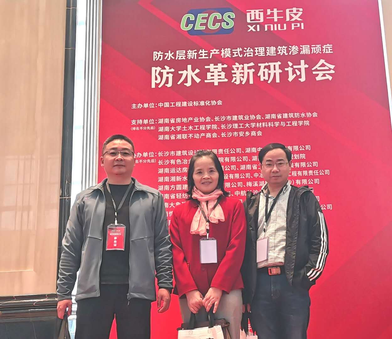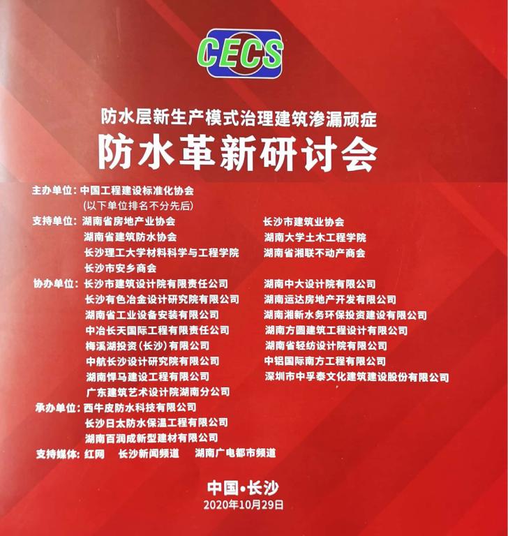 2020年10月29日,由中国工程建设标准化协会主办、西牛皮防水科技有限公司承办的“防水层新生产模式治理建筑渗漏顽症防水革新研讨会”在长沙举办,旨在推动建筑防水材料产业结构升级和高质量发展,从而促进建筑防水质量得到更高水平的提升。会议就当前防水创新发展新趋势、建筑防水新材料及其它相关防水质量问题如设计、施工、管理等进行了研讨,并现场发布了《现制水性橡胶高分子复合防水卷材》(T/CECS10017-2019)标准。
