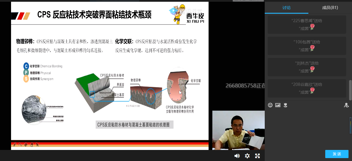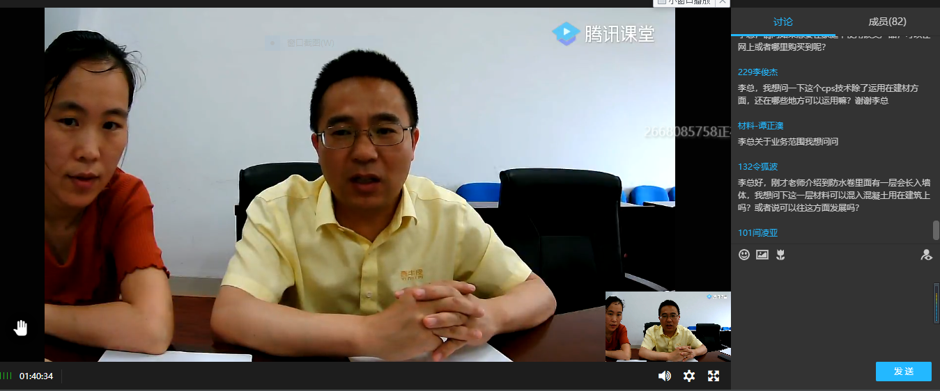 课上,李总从防水的意义出发,用图片、视频等资料为同学们展示了各种漏水情况,深度解剖工程构架,对粘结机理图进行了详细讲解。在互动环节,同学们争先提问,李总认真地回答了学生们在专业上的问题,并对学生们在就业定位,岗位选择,等方面给出方向性意见。在线上课堂的轻松氛围中,学生们很好地发挥自身聪明才智,在评论区相互帮助,集思广益,对问题的展开探究更加深入,对自身未来的规划更为明确。