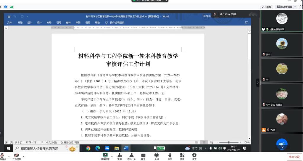 为迎接教育部新一轮本科教育教学审核评估,12月20日下午3:30,无机非金属材料工程系召开线上会议,就《威廉体育williamhill新一轮本科教育教学审核评估工作方案》、《材料科学与工程学院新一轮本科教育教学审核评估工作计划》等相关文件开展学习研讨,会议由系主任刘鹏主持,全系教师线上参会。会上,刘鹏首先介绍了学校印发的审核评估工作方案。随后,刘鹏结合无机非金属系已经开展的工程教育认证工作,对审核评估中的指标体系进行了分项解读,并依次就学院自评结果进行了说明。