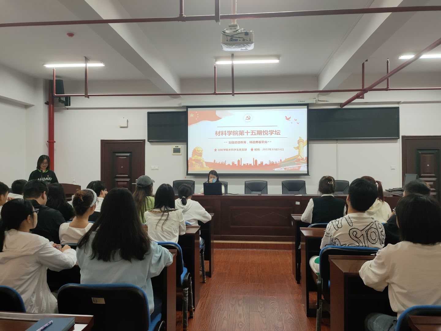 10月16日晚,材料科学与工程学院本科学生党支部于新能源一号楼302室举办第十五期悦学坛常态化学习活动,本次悦学坛主题为“加强思想教育,铸造青春荣光”。本次悦学坛由预备党员邵琪主持,共47名积极分子参加。