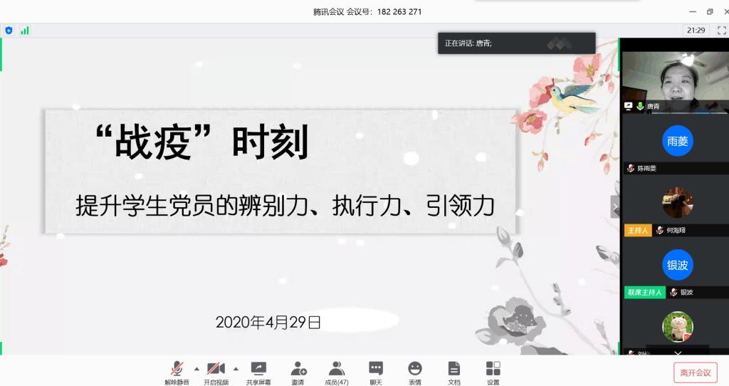 4月29日,材料学院依托腾讯会议平台组织学生党员专题党课,由学院党总支副书记唐青主讲,学院全体研本学生党员50余人参与。