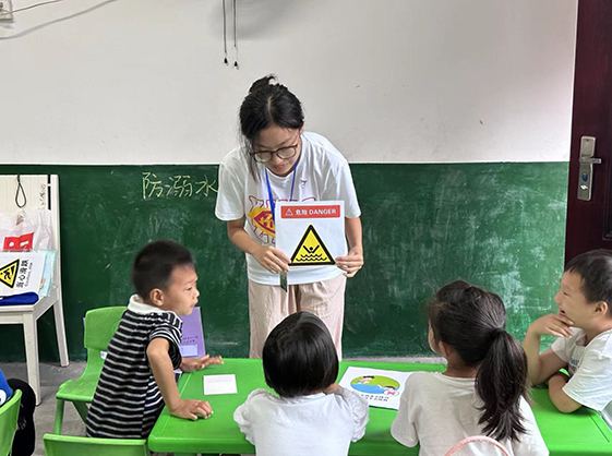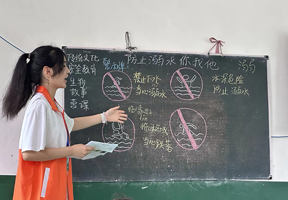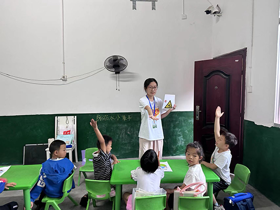 活动紧紧围绕防溺水安全教育专题,课堂上,支教队员根据不同学生的年龄特点因材施教,通过集体观看视频图片、手绘展板和讲解案例等方式,引导学生认识防溺水的标志,学习如何预防溺水及溺水救护方法的安全知识。在支教老师生动有趣的讲解引导下,课堂互动积极活跃,孩子们认真学习防溺水知识,并将自身经历与课堂知识相结合,踊跃分享感悟。