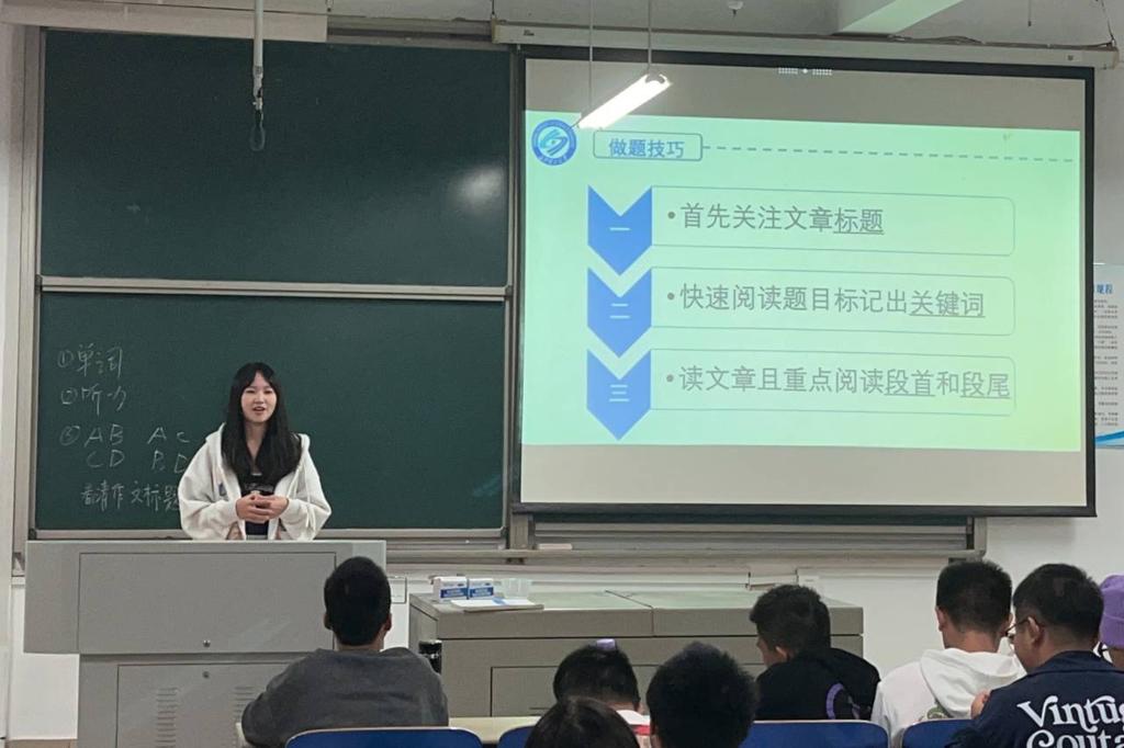 首先,周鑫着重介绍听力答题技巧,他表示听力要提前阅读题目,划出关键词,没有听懂也不要在一道题目上花费过多时间,采取“所听及所选”的方法将会大大提高正确率。接着,冯英强调词汇的重要性,并就阅读理解题型提出了“先看题目再读文章”的答题方法。随后,叶清荃详细地讲解了阅读部分的题型与分值,并就长篇阅读分享了做题技巧。最后,王金哲着重讲解了作文部分和翻译部分,针对不同类型的作文,开头起笔需要采取不同的方法,而翻译题则需注重词汇。