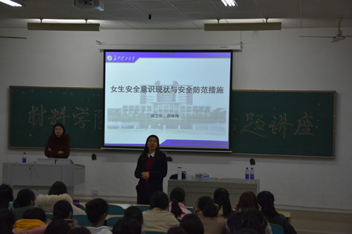 3月7日,材料学院于综合教学楼A105举办女生安全专题讲座,本次讲座由保卫处副处长郑咏梅主讲,院党总支副书记唐青、辅导员陈鑫林、谢易真出席,材料学院研究生、本科生女生参加。