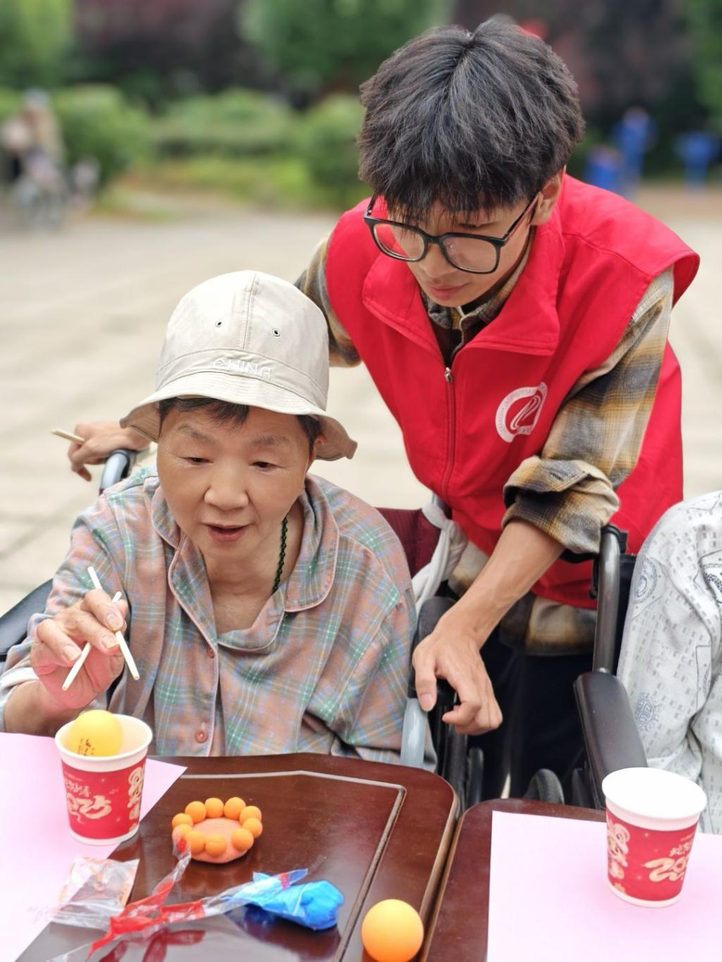 随后,志愿者与老人们分组结对,共同参与了“剪纸”和“筷夹乒乓球”两项趣味游戏。在剪纸环节,老人们与志愿者默契配合,一幅幅生动的图案在剪刀与彩纸间诞生,其中一位78岁的爷爷更是技艺超群,迅速完成了自己的作品,并分享了年轻时剪纸的趣事,引得现场笑声连连。筷夹乒乓球游戏中,老人们更是展现出不服老的精神,即便初次尝试困难重重,也在志愿者的鼓励下逐渐掌握技巧,成功夹起乒乓球,现场欢呼声不断。