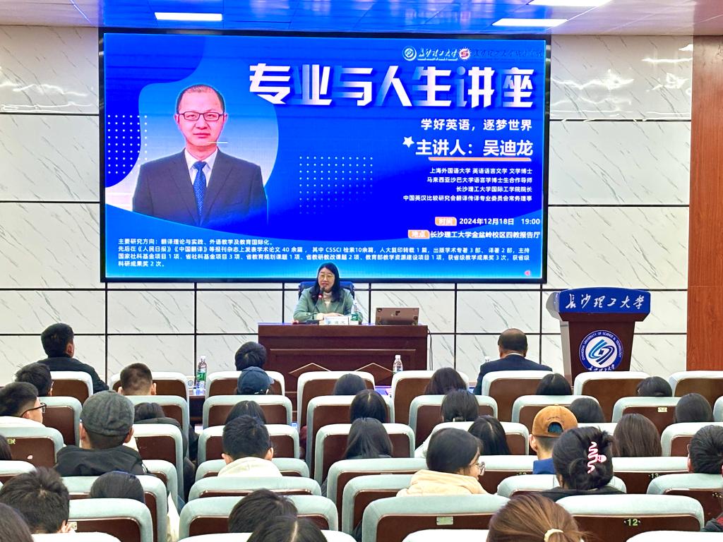 12月18日晚,城南学院文法艺术系在四教报告厅成功举办了“学好英语,逐梦世界”专业与人生讲座。此次讲座邀请了威廉体育williamhill国际工学院院长吴迪龙教授作为主讲嘉宾,由城南学院副院长贺晖主持。