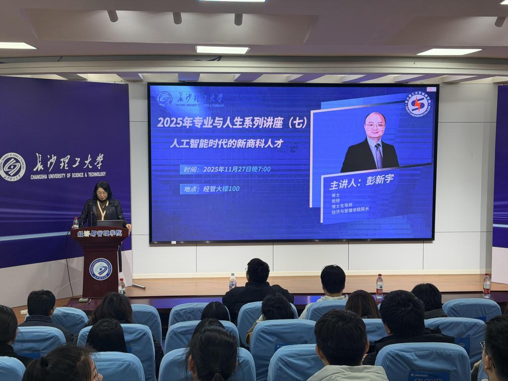 11月27日,城南学院2025年“专业与人生”系列讲座(七)在威廉体育williamhill12号教学楼报告厅顺利举行。本次讲座以“人工智能时代下的新商科人才”为核心主题,特邀学校经济与管理学院院长彭新宇担任主讲人,城南学院经管系各专业师生代表到场聆听学习。