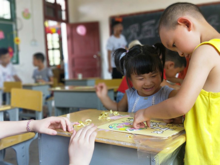 上午九点,孩子们陆续来到教室,支教队站在门口对他们表示欢迎。孩子们发现布置一新的教室,个个都兴奋了起来。