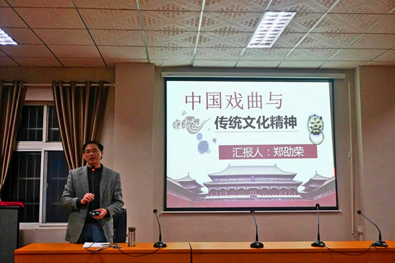 郑劭荣在讲解的过程中声情并茂。他与大家分享了中国戏曲概况和传统文化精神,指出戏曲作为一种古老的艺术表现形式,有着悠久的历史和深厚的群众基础,是传承和弘扬中华优秀传统文化的重要载体。他强调,戏曲有声有色、雅俗共赏;其注重虚实相生、形神兼备、刚柔并济,是综合艺术;它写意性、虚拟性与现场性相结合,更强调一种精神,那就是人类在面对爱情时所展现出的顽强坚韧的精神,只有当家庭和谐了,社会才会和谐,国家才会和谐。