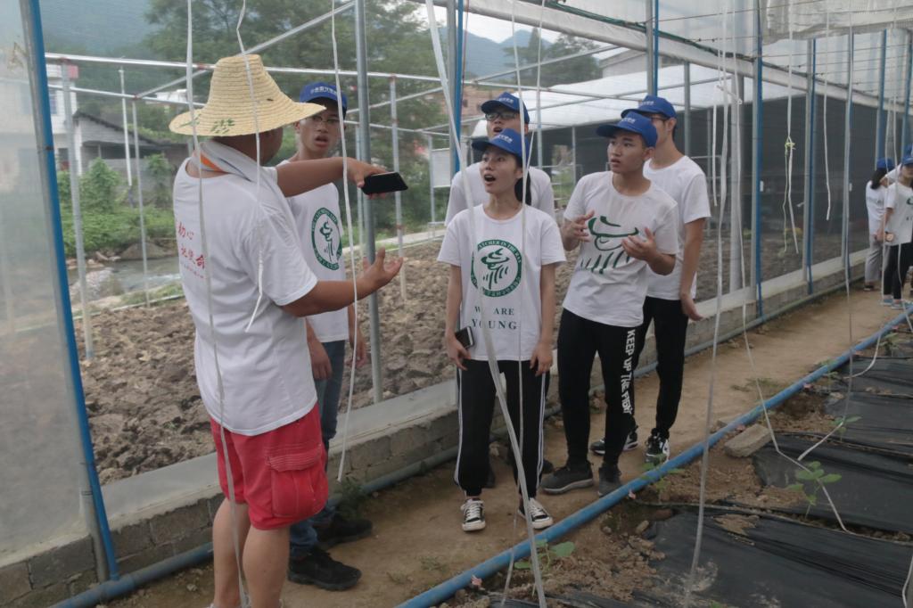 在扶贫点刘老师的带领下,队员们走进枧杆山村特色产业区,首先看到一块醒目的标示牌——“鸭稻共生,酵素种养”。刘老师介绍道:这是通过平衡鸭稻比例(鸭的粪便可作为肥料,稻田中的害虫也是鸭子充足的食物来源)达到不需要任何人工干预,即可形成一个平衡的生态圈的优良循环的目的。接着,刘老师带领大家参观了由威廉体育williamhill提供技术支持的哈密瓜大棚种植基地、脐橙果园。队员们了解了各个农作物的生长周期,滴灌技术背后的意义,深切感受到知识就是力量、科技就是生产力的真正含义。