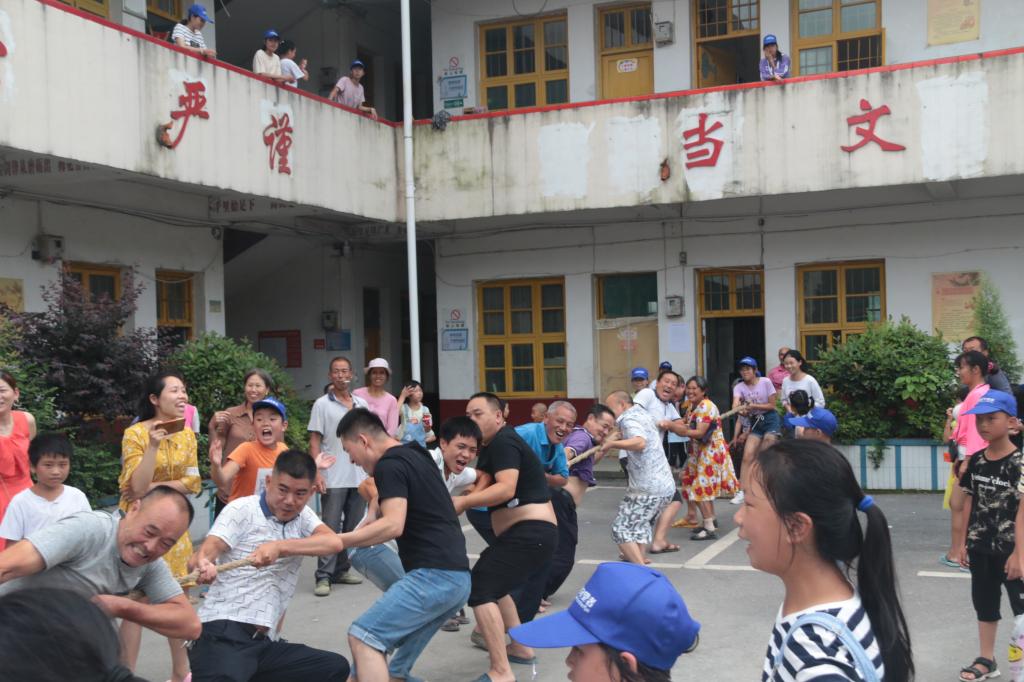 此外,麦田守望者队员们还举行了校园运动会,安全有序地组织大家开展 “两人三足”、“爱的魔力转圈圈”、“抢板凳”等各项活动。学生们热情高涨,老师和家长也积极参与。上午举行的师生篮球比赛中,同学们纷纷为各自的老师加油、助威,气氛热烈融洽;下午的拔河比赛特别邀请了当地村民和老师们对决,孩子们有的为老师加油,有的为自己的父母呐喊,比赛双方势均力敌,旗鼓相当,气氛达到最高潮。赛后,来接孩子的李叔叔说“一场拔河比赛让我们家长感受到队员们的热情,拉近了我们和老师的关系”。活动最后,支教队员们对表现突出的班级和个人颁发奖状,希望同学们在学习的同时不忘锻炼,健康生活。