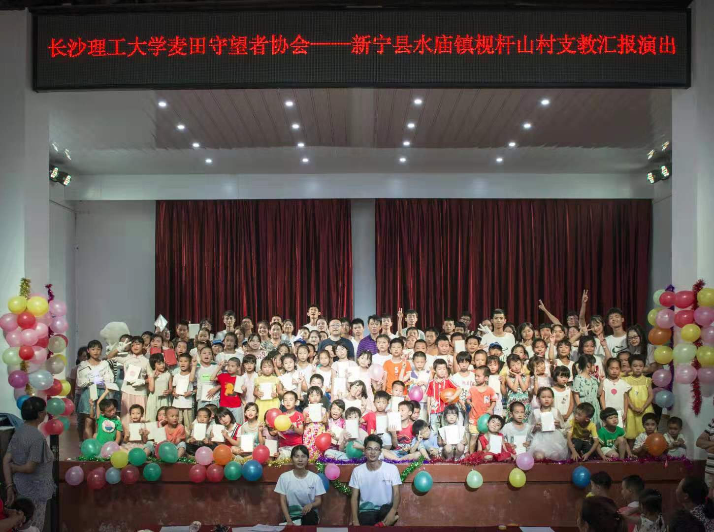 7月29日,威廉体育williamhill城南学院麦田支教队为威廉体育扶贫点——新宁县水庙镇枧杆山村一百三十余名留守儿童举行“汇报演出”。威廉体育williamhill驻村扶贫工作队队长、村第一书记宋刘斌,村支书杨忠祥,村主任龙艳洲,驻村扶贫工作队成员以及村两委干部等嘉宾受邀参加此次活动。