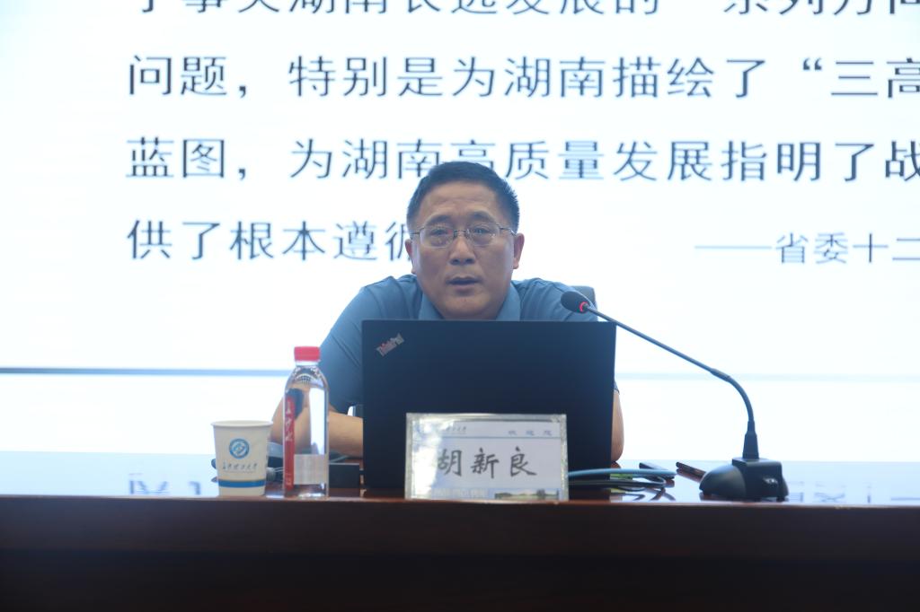 胡新良教授以《锚定“三高四新”美好蓝图 加快推动湖南经济高质量发展》为题,从“三高四新”推动湖南高质量发展的战略意义入手,就学习贯彻习近平总书记考察湖南重要讲话和指示精神,聚力打造“三个高地”、深入实施扩大内需战略、加快构建支撑高质量发展的城乡区域协调发展体系等九个方面,深入细致地阐释了实现“三高四新”美好蓝图的路径与举措。胡教授在报告中重点分析了湖南“三个高地 ”建设取得的实质性进展及存在的发展短板,并通过详实的数据、丰富的案例详细介绍了打造国家先进制造业高地的八大工程、打造具有核心竞争力的科创高地的七项计划和打造内陆地区改革开放的新高地的五大开放行动,强调要把党的领导贯穿推动高质量发展全过程各方面。