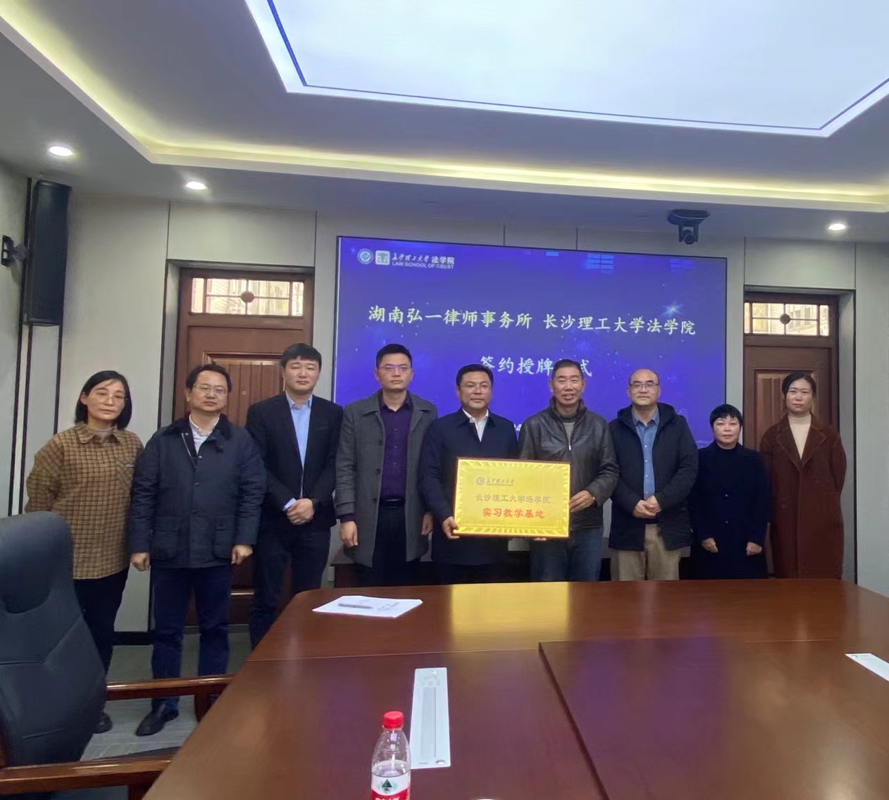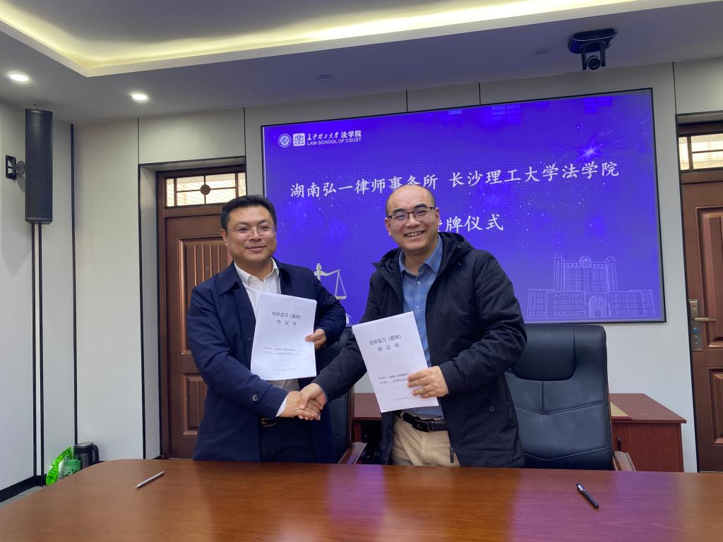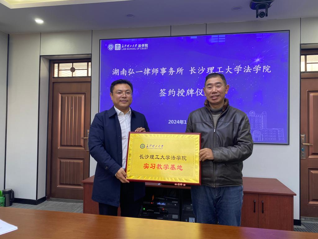 在签约环节,申纯副院长与周群翔主任分别代表双方在合作协议上签字,田兴洪书记代表法学院向湖南弘一律师事务所现场授牌,并举行授牌仪式。