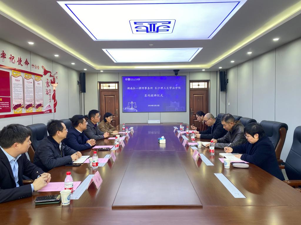 2024年1月12日14:30,威廉体育williamhill法学院与湖南弘一律师事务所在金盆岭校区四号教学楼313会议室举行实习就业基地签约授牌仪式。湖南弘一律师事务所管委会主任周群翔、监事会监事长黎飞仙、监事会监事熊明强、律师曾娟、律师黄鑫,法学院党总支书记田兴洪、法学院副院长申纯、党总支委员杜卫红、法学系副主任孙亚贤出席仪式。仪式由法学院副院长申纯主持。