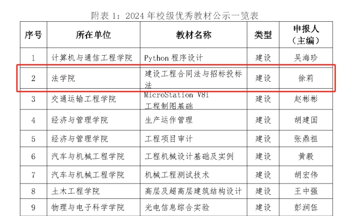 近日,由我院徐莉教授主编工程法课程团队、工程法实务导师共同参与申报建设的《建设工程合同法与招标投标法》教材在2024年校级优秀教材评审中批立项。
