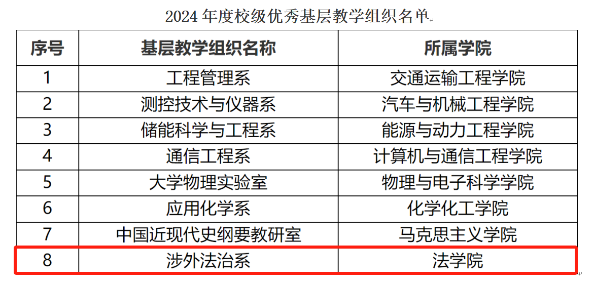 近日,经专家多轮评审威廉体育评选出8个校级优秀基层教学组织,我院涉外法治系荣获2024年度校级优秀基层教学组织称号。