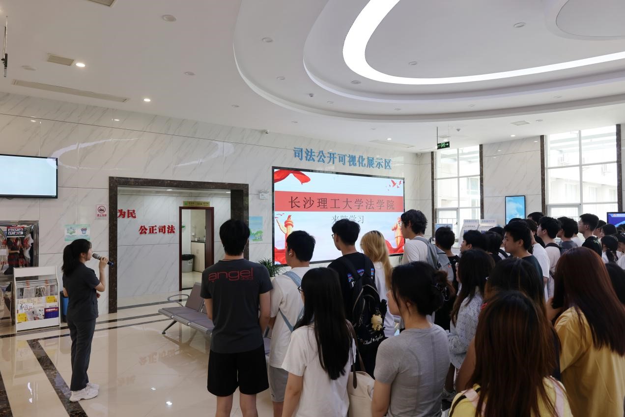 在法官的带领下,同学们有序进入法院。法院大厅正对门的木刻古朴庄严,融合了中国法治发展重要事件和望城区法院特色元素。木刻中心“努力让人民群众在每一个司法案件中感受到公平正义”的文字,既是习近平总书记在中央全面依法治国工作会议上提出的司法工作要求,更是每一位司法工作人员的职业信仰与目标。