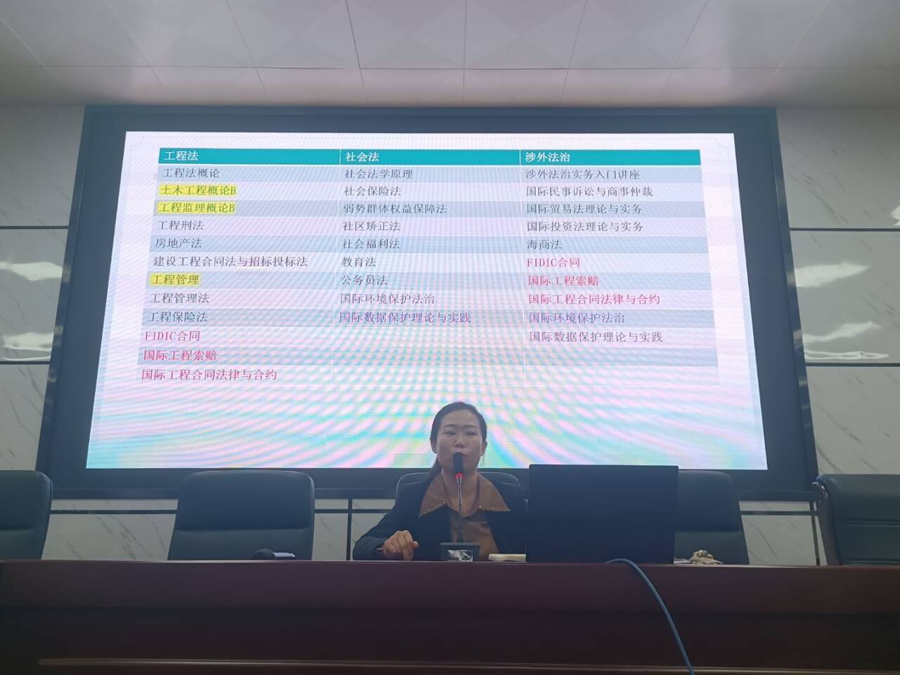 本次会议由法学系主任孙亚贤老师主持召开,首先,孙亚贤老师从培养目标、核心课程设置、未来就业深造前景等方面详细介绍了工程法学、社会法学、涉外法治三个专业方向。随后,解读了专业分流的工作流程、时间安排、志愿填报方式。最后,针对同学们针对专业分流提出的疑问进行了细致的解答。