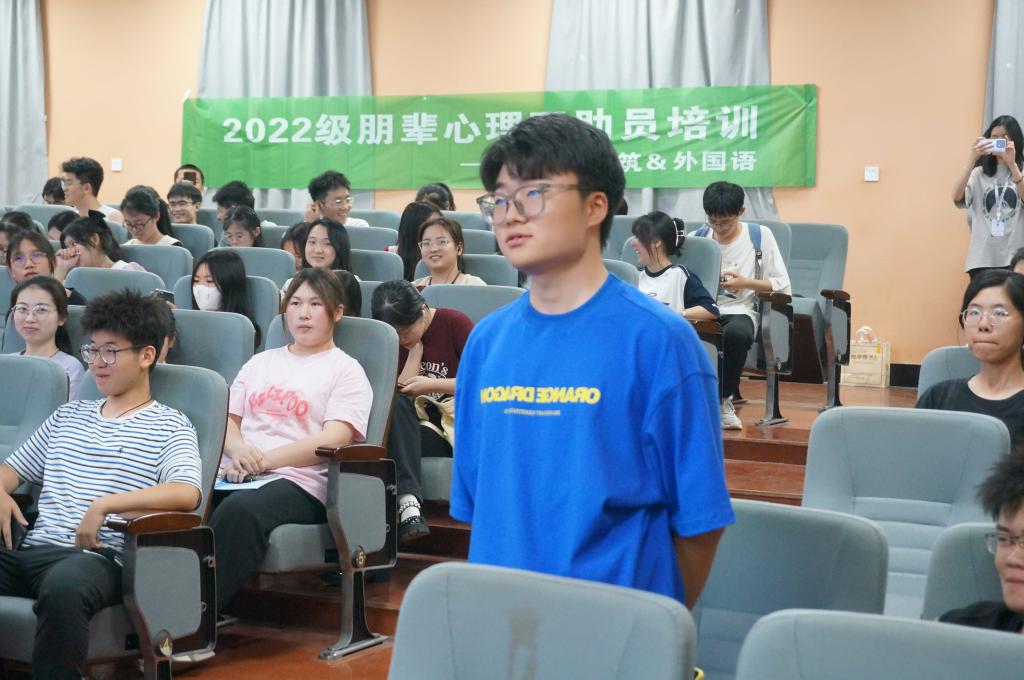 根据学校心理健康教育中心《关于组织开展2022级朋辈心理互助员上岗培训的通知》文件精神要求,结合学院实际情况,围绕学院学生工作特色,为帮助2022级朋辈互助员提高心理互助工作能力,促进学生心理健康成长。2023年4月17日,法学院、建筑学院、外国语学院在四号教学楼报告厅联合开展了2022级朋辈心理互助员第一次和第二次培训工作。