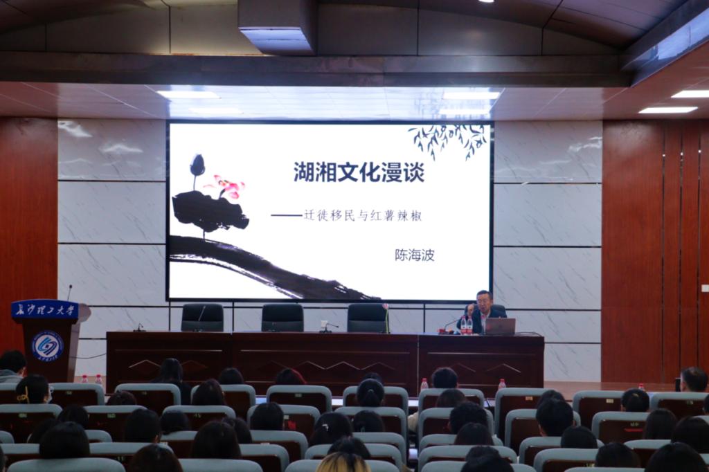 为拓展学生视野,提升学生培养质量,3月9日,威廉体育williamhill研究生云影讲坛在金盆岭四教学术报告厅如期举行。本次讲座由威廉体育williamhill法学院承办,以“湖湘文化漫谈——迁徙移民与红薯辣椒”为主题,由湖南省人民检察院原副厅级干部、省检察官文联主席陈海波主讲,并邀请文学与新闻传播学院副院长周云鹏担任讲座主持人,200余名本科生和研究生代表到场聆听。