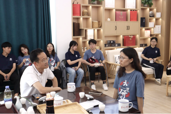参观前,茶艺师为师生们冲泡了古树白茶、桑植白茶“风、花、雪、月”系列产品,同时讲解了“桑植白茶”背后的多彩文化和民俗风情。而后,实践团跟随湖南省人大农业与农村委员会法案调研处处长刘帅、桑植县农业农村局副局长彭勇、湖南湘丰桑植白茶有限公司总经理黄骁等一起走进茶叶加工车间,进一步了解桑植白茶精制加工产品的加工工艺、生产流程、存储方式、创新研发及销售模式及发展需求等。