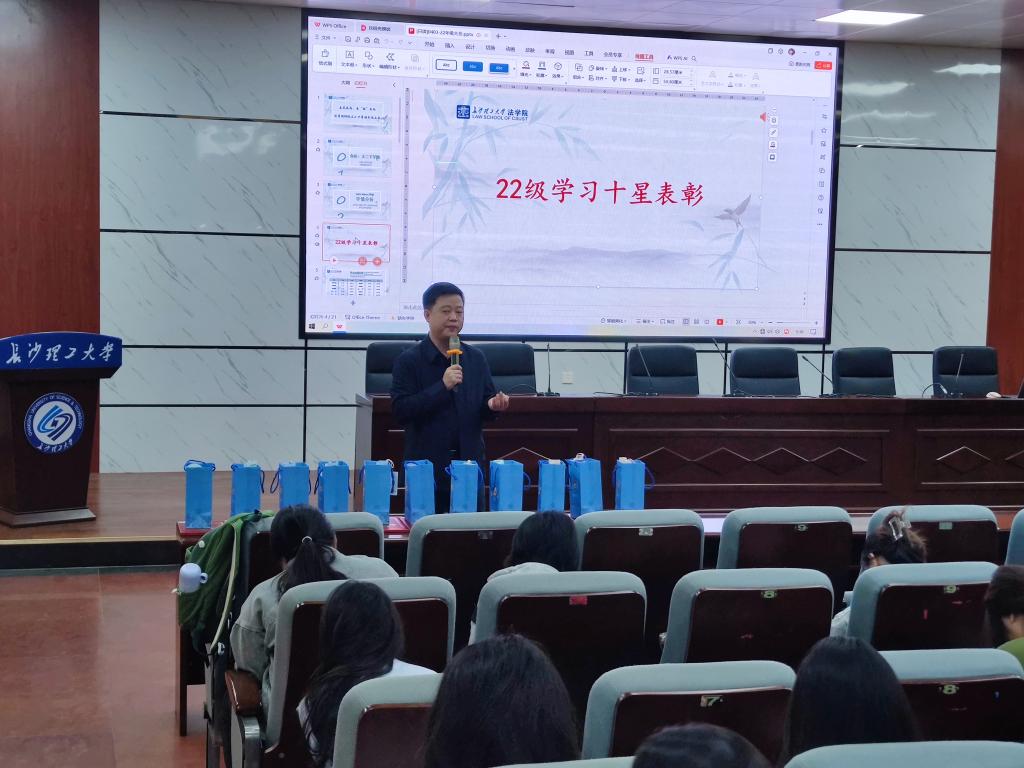 春日暖阳,草长莺飞。4月3日上午,法学院在四教报告厅开展了一次难忘的年级大会暨学情分析大会,主题为:“春日序曲,当燃不让”,会议由辅导员孙佳乐老师主持,学院党委副书记汪伦讲话。内容包含:本学期存在的问题和学习规划、上学期学情分析、考研和就业展望、“学习十星”表彰等四个环节,2022级全体学生参加会议。