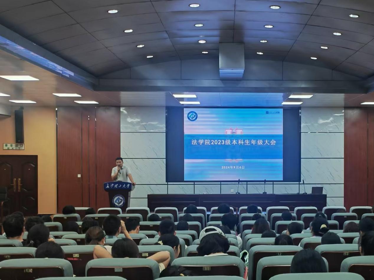 为进一步加强2023级学风建设工作,做好新学期年级安全稳定工作,引导学生尽快适应新学期的学习生活,9月6日晚19点,法学院于四教报告厅召开2023级年级大会。本次会议由法学院2023级辅导员兰贵辉老师主持,2023级全体同学参加。