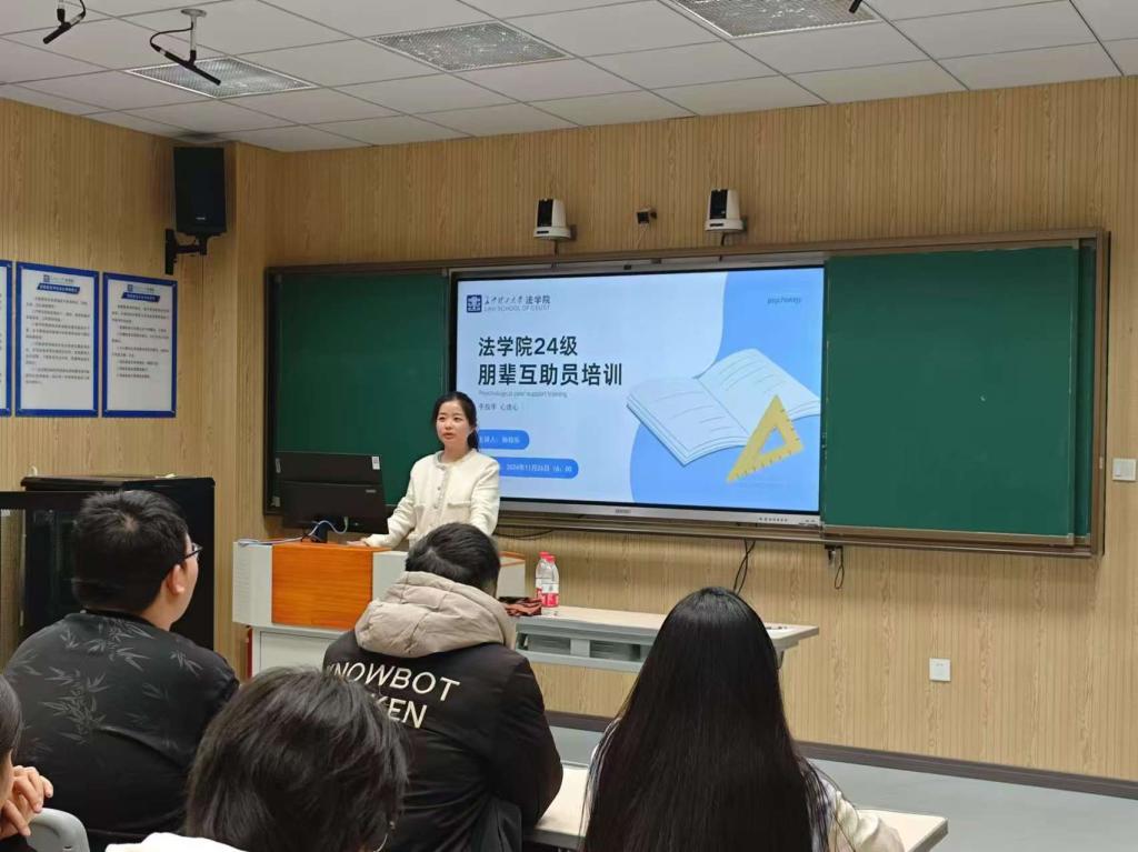 为加强学生心理朋辈互助员队伍建设,推动心理育人工作,法学院于11月26日16点在四教305教室开展了新生朋辈互助员培训会,会议主题为:“朋辈互助员基本知识”。本次培训由法学院心理辅导员孙佳乐老师主讲,法学院全体新生朋辈互助员参会。