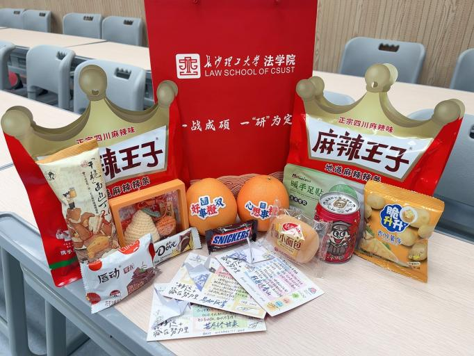 活动最后,龚文斌和张敏纯为每一位考研同学发放了“考研福袋”,福袋使用红色手提袋包装,表面印有“一战成硕,一研为定”的祝福语。福袋中装有“心想事橙”甜美橙子、“柿柿如意”好运挂件、“运气旺旺”旺仔牛奶、“暖身、暖心又暖胃”的暖手宝、祝福卡片和零食等,饱含着学院师生对考研学子的关心与祝福,鼓励每一位备考同学以昂扬的斗志和积极的心态坚持到最后一刻。