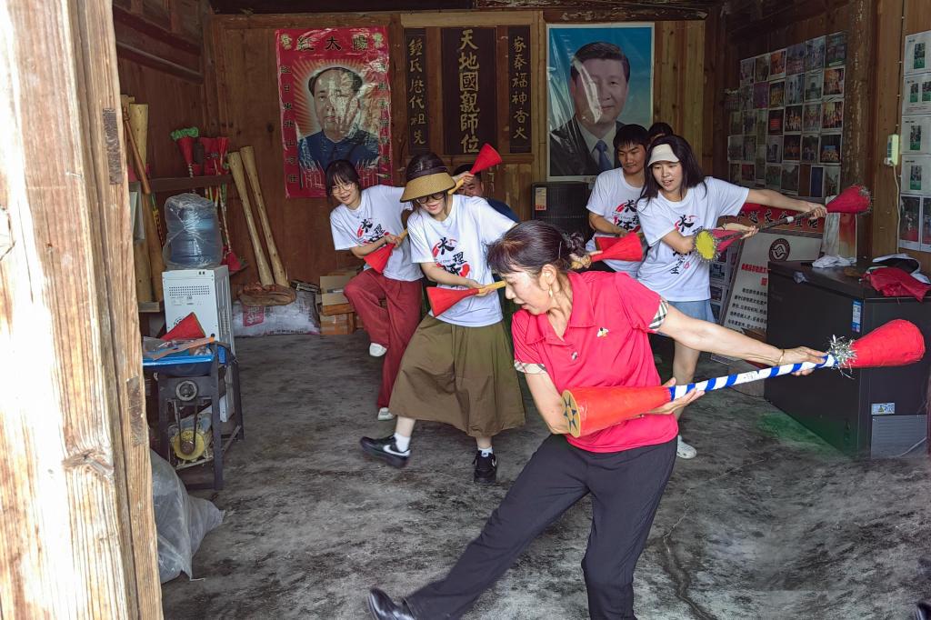 会议结束后,实践团成员们来到了国家级非遗传承人钟必武先生的家中。在这里,传承人们为成员们带来了精彩的仗鼓舞表演。那灵动的身姿、矫健的步伐、欢快的节奏,仿佛将大家带入了一个充满神秘色彩的白族文化世界。表演结束后,团员们还亲自体验学习了这项充满魅力的非遗技艺。在传承人的耐心指导下,大家从最初的笨拙生疏到逐渐掌握要领,深刻感受到了非遗文化的独特魅力和深厚底蕴。