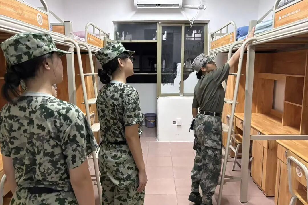 训练归来,走进新生寝室,教官们褪去了训练场上的严肃,化身细致的“生活导师”,手把手教学叠被子的技巧。从抚平被子到捏出棱角,讲解如何将被子叠得方方正正。同时,教官们还细致叮嘱大家,要保持寝室环境的干净卫生,不仅要打造整洁的居住空间,更要在日常点滴中培养自律严谨的生活习惯,让新生们在细节处感受到军训带来的成长与蜕变。