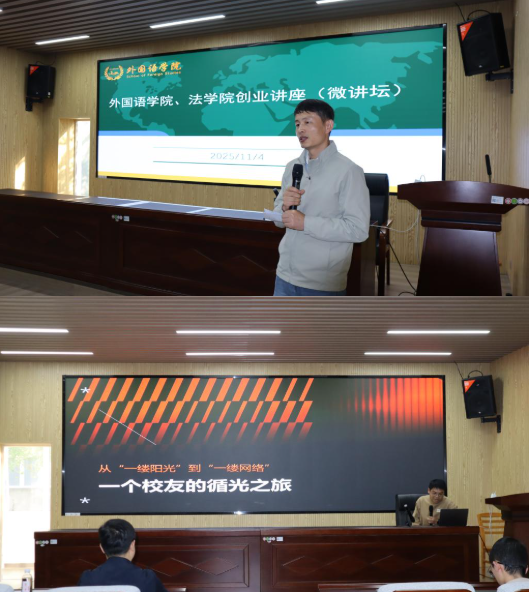 为深化创新创业教育,助力学生职业规划,11月4日下午,由法学院与外国语学院共同主办的创业微讲坛在三教229教室顺利举行。论坛特邀湖南一缕网络科技有限公司总经理王宇、湖南青投贸易有限公司总经理柳标两位优秀校友担任主讲嘉宾,他们结合个人创业与职场经历,为在场学子带来了一场兼具前瞻性与实操性的经验分享。法学院党委副书记汪伦、外国语学院党委副书记周芳及80余名学生共同参与活动。讲座由外国语学院团委书记郭恒主持。
