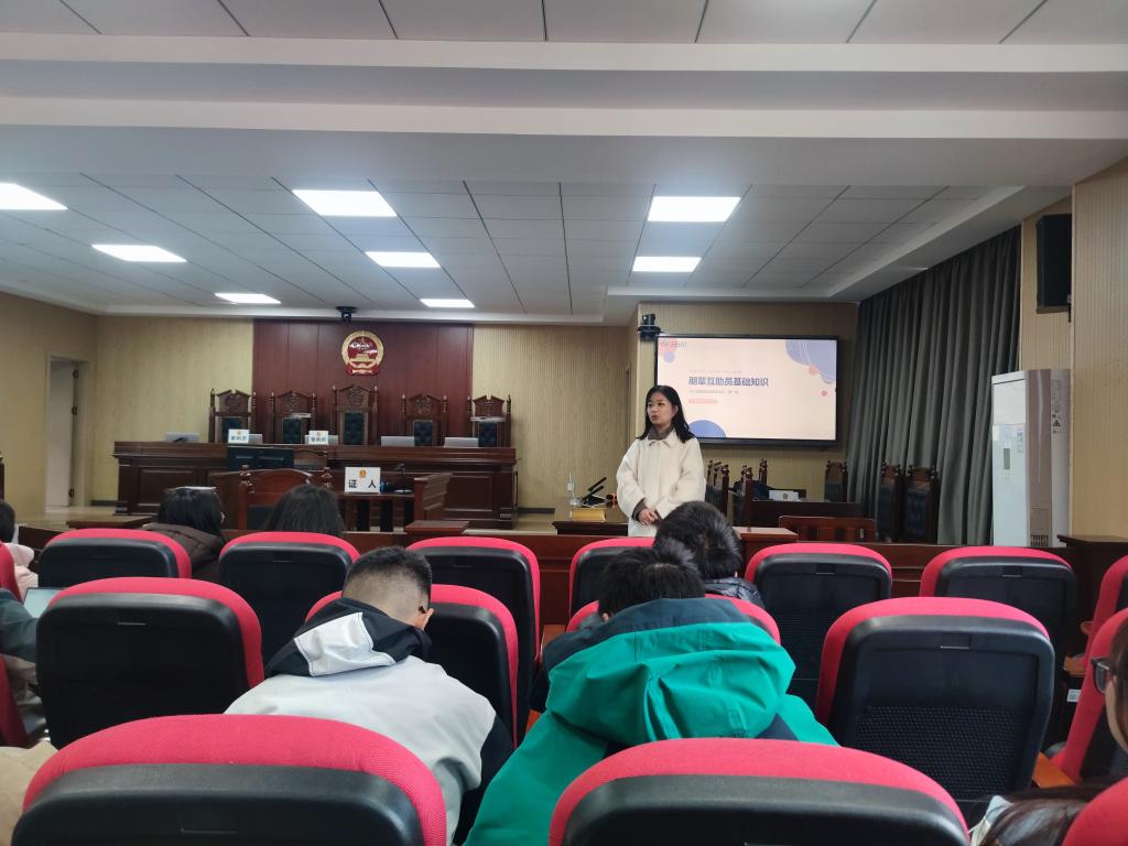 为进一步强化学生心理朋辈互助员队伍建设,切实提升心理育人工作实效,法学院于11月18日下午在四教模拟法庭顺利举办2025级本研新生朋辈互助员专题培训会。本次培训会由心理辅导员孙佳乐主讲,全体25级本科生及研究生朋辈互助员参会。